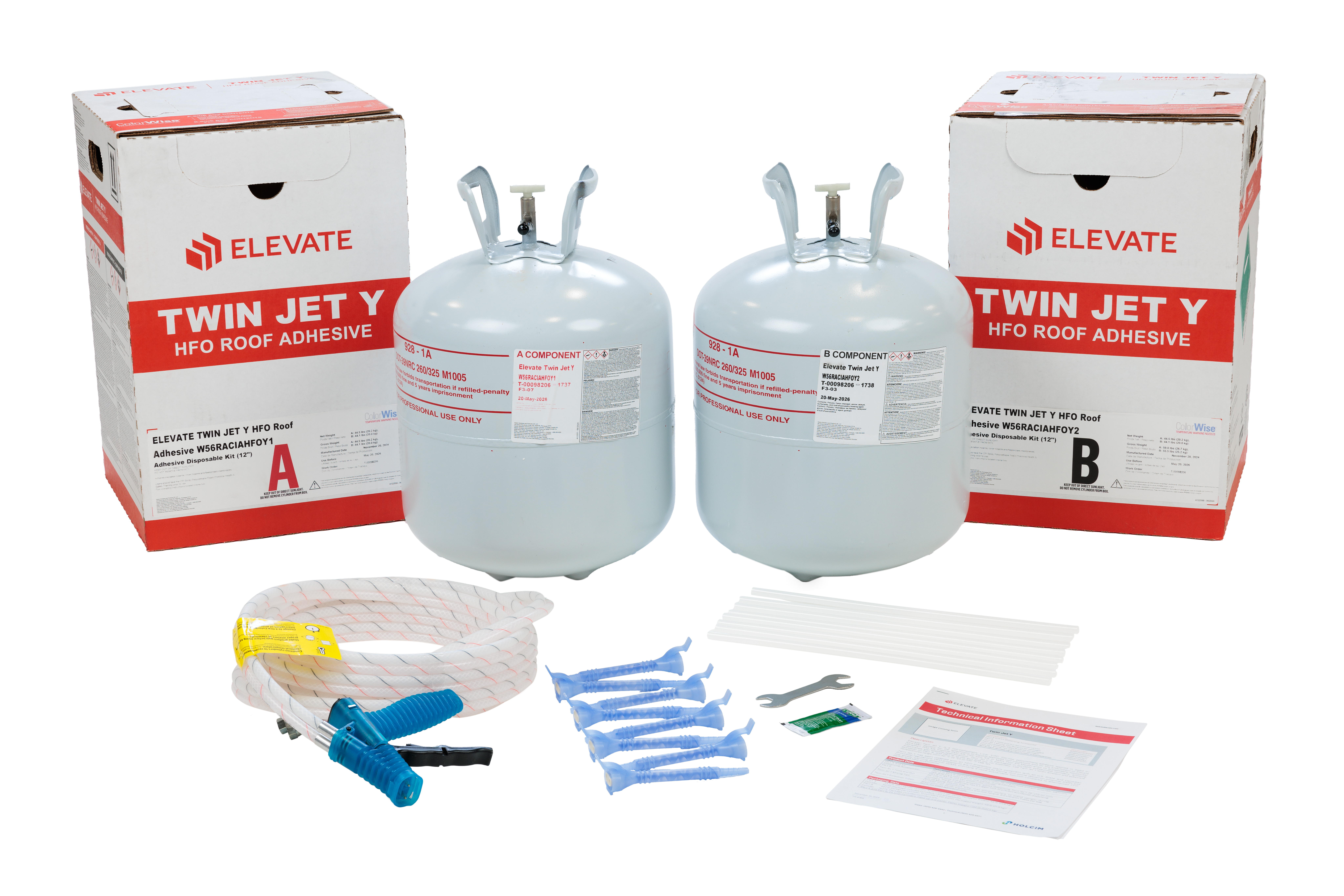 Twin Jet is a two-component, low-rise polyurethane adhesive applied in bead pattern for the attachment of Elevate-approved roof insulations. It may also be used in bead or spatter pattern for the attachment of Elevate PVC XR, PVC KEE XR and MAX PVC XR membranes to acceptable horizontal substrates, per Elevate specifications. Twin Jet is packaged in portable pressurized canisters, allowing extrusion of Part 1 and Part 2 to the gun and mix tip assembly.