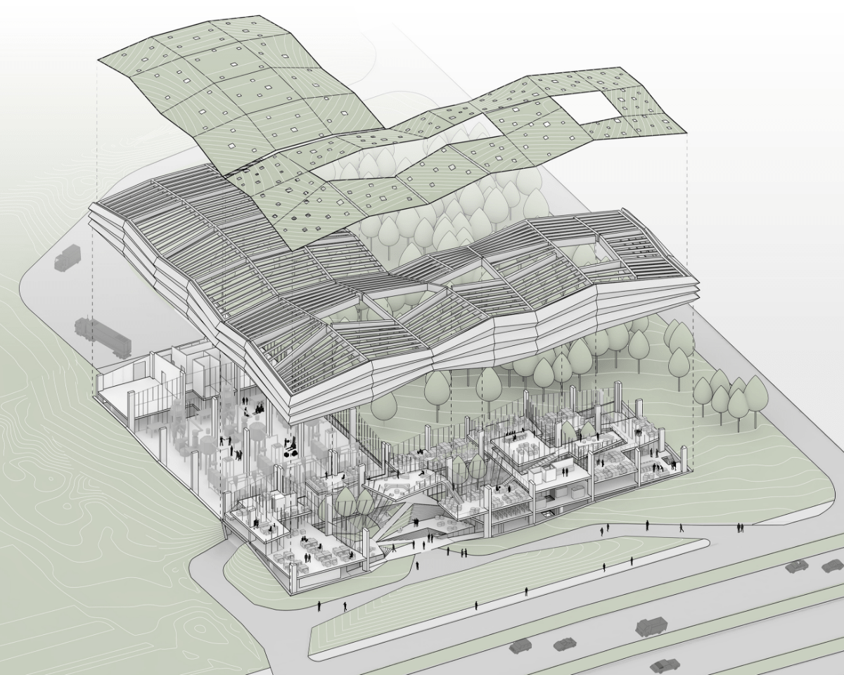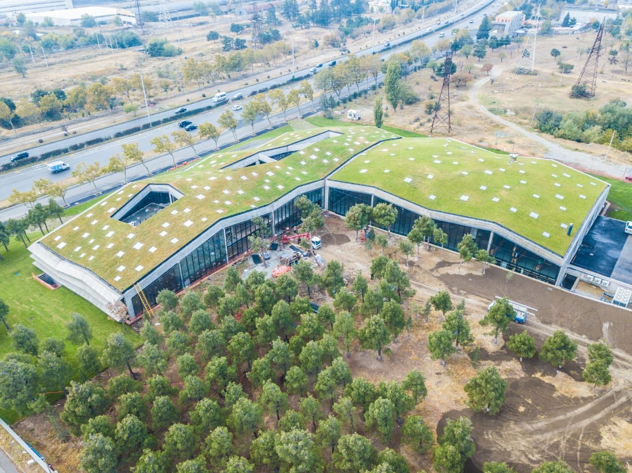 FUTURISTIC FACTORY EMBEDDED IN GREEN LANDSCAPE