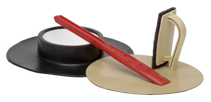 Pre-fabricated pipe boot with a QuickSeam tape laminated to the bottom of its flange. Specifically designed for flashing rigid round penetrations and conduits of 13 mm to 64 mm.