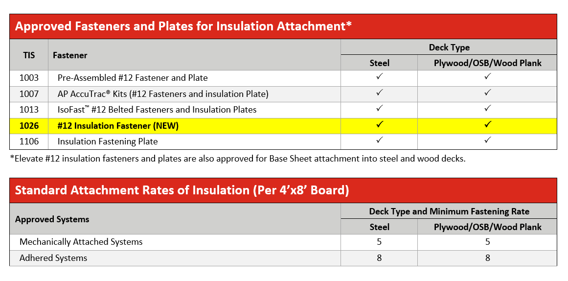 Elevate #12 fasteners and insulation plates may be used in new construction, full or partial tear-off, and re-cover applications at the listed rates. Elevate All-Purpose (TIS 1001), Heavy-Duty (TIS 1002), and Heavy Duty Plus fasteners are approved for insulation attachment in all warranted applications. Consult the appropriate building code authority to ensure compliance with re-roof requirements.