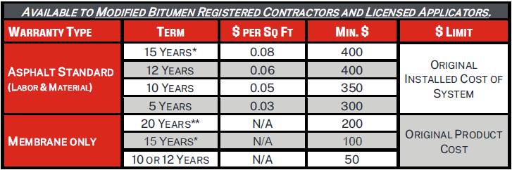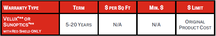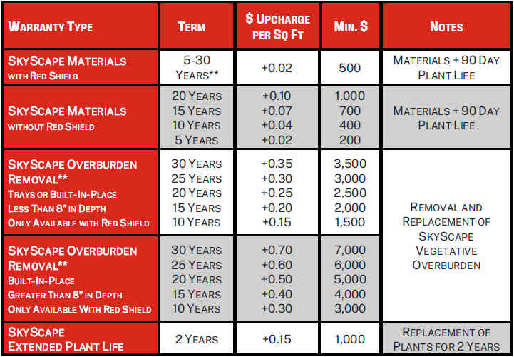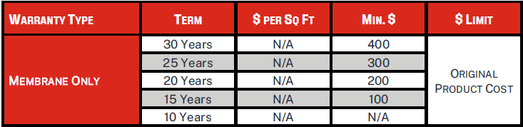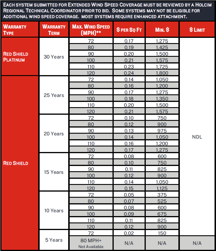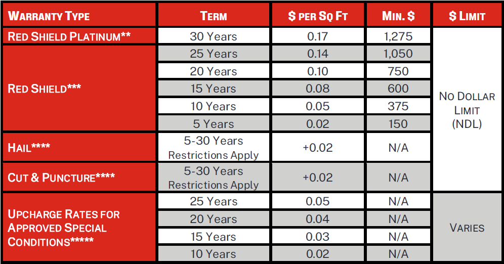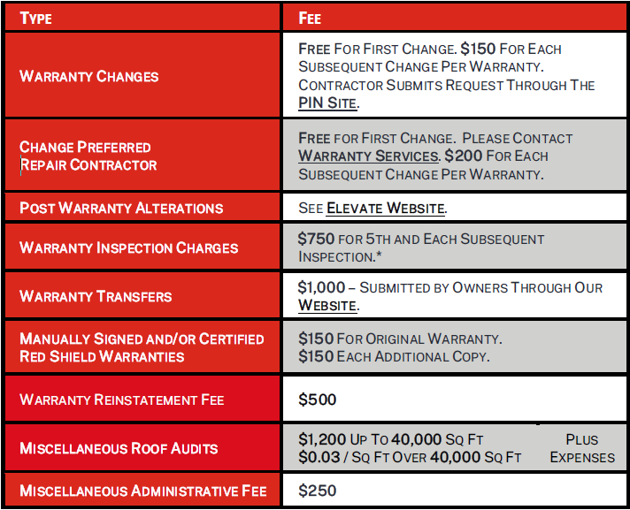 - A revised schedule of warranty fees is attached to this bulletin. The base charge for a 20 Year Red Shield™ Warranty is being reduced from $0.12/SF to $0.10/SF, and some administrative fees are being adjusted based on market conditions.