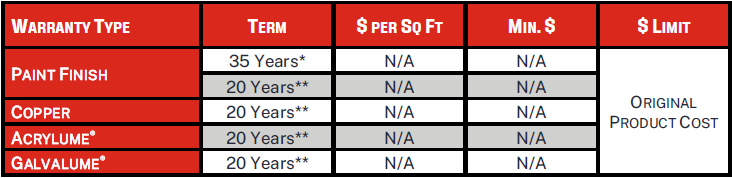 - The UNA-CLAD™ Metal Finish Warranty request forms on our website for roofing and walls have been consolidated into a single form. This form is mostly used by non-licensed contractors, but licensed Elevate applicators may also use it to receive 20 year warranties on Elevate Copper, Galvalume®, and Zincalume® Plus. Paint Finish Warranties are available through our website for 20 years or 35 years. See warranty samples for specific coverage and terms. There is no fee for Elevate Metal Finish Warranties issued through our website, or to licensed applicators through our PIN Site. Finish warranties are provided for factory-formed UNA-CLAD panels, UNA-EDGE prefabricated edge metal systems, flat sheets, and coil.